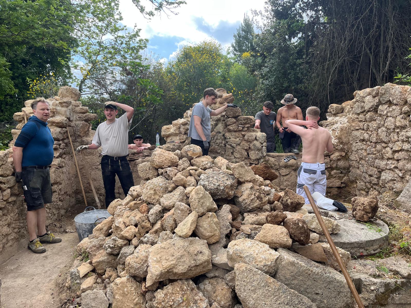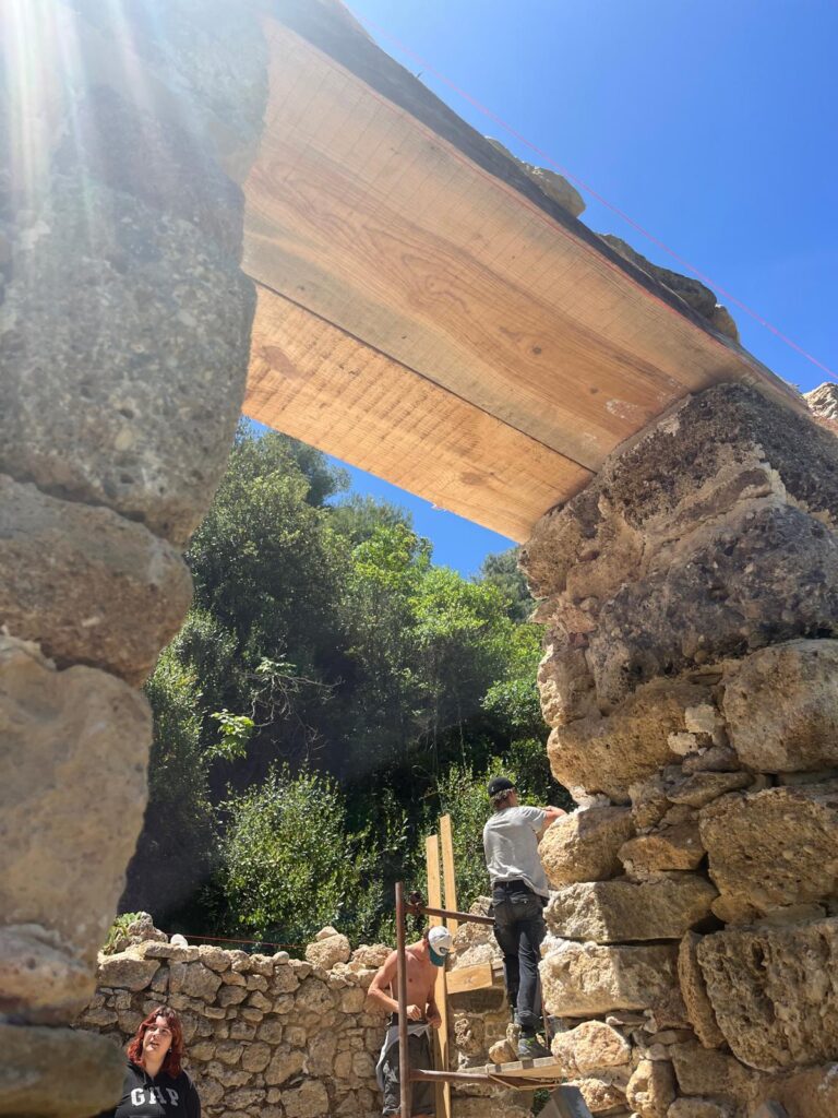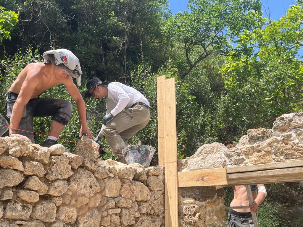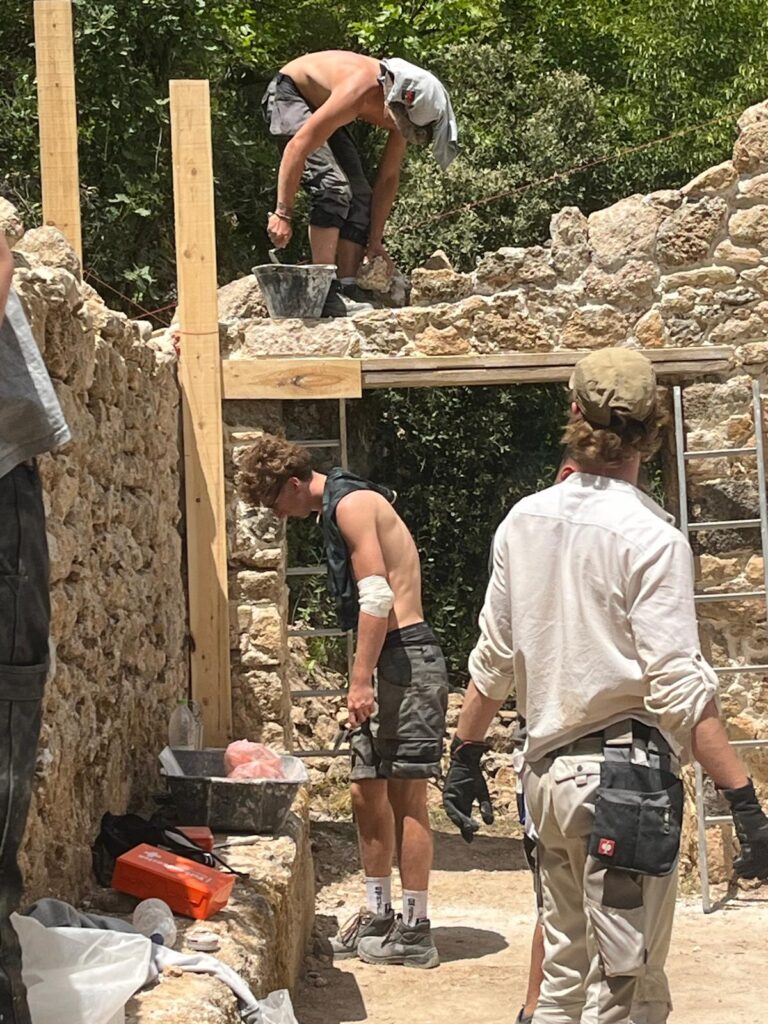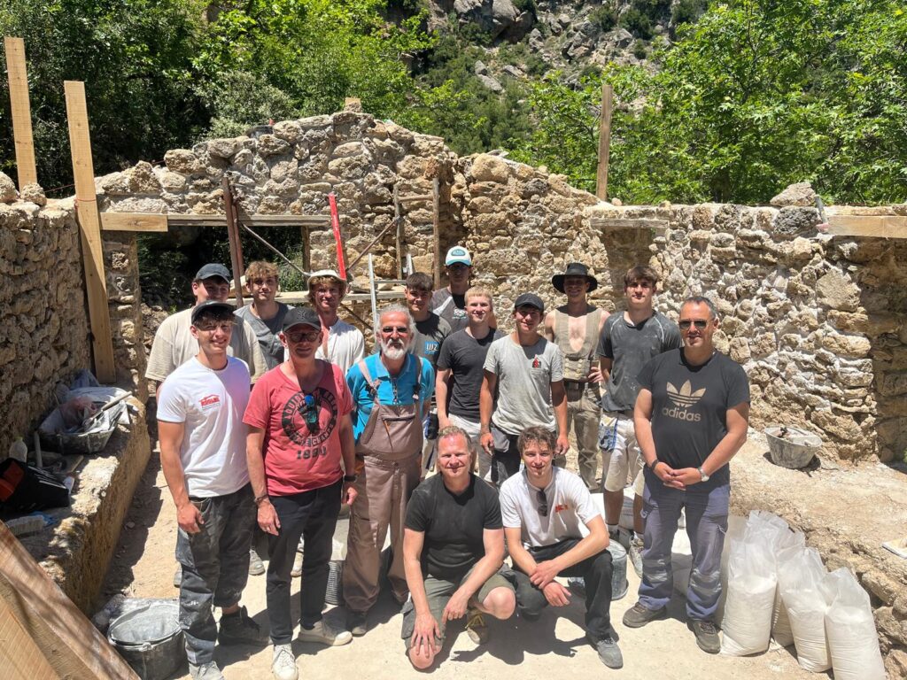 In May 2025, another exchange program was implemented by the Greek-German Youth Foundation (EGIN) with the participation of students from the Bildungsverein Bautechnik, the Knobelldorff-Schule OSZ-Bautechnik from Berlin, and EPAL Kiato, which lasted three weeks. During this phase, the restoration of the walls with lintels on the remaining windows and traditional senaz around the perimeter of the wall was completed. The old stones that were missing from the walls were replaced with donations of old stones from the village ruins, which were offered free of charge by the families of Georgios Nikolaou and Sofia Marini. All the materials were carried by hand by the trainees, as there is no access for vehicles to the mill. The advice of craftsmen and residents of Kryoneri was invaluable for this project.